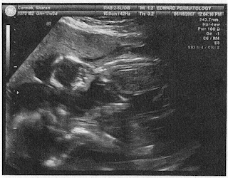 Sharon and I knew she was pregnant during our first visit to the OB doctor, but we were quite shocked when the doctor did an ultrasound and said, "Well, they both look fine!" I don't believe I have ever been more stunned in my entire life. They were so cute, too; wiggling like crazy! I mean, they were really moving: shaking their little arms and legs so fast! We called them "the wiggles" for months. You can see a set of ultrasound pictures here.
