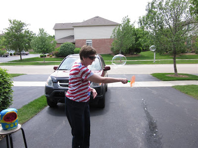 At the zoo last weekend, Nana had gotten Gavin an extra big bubble wand, so we moved on from the bubble machine to the wand. Gavin loved popping the giant bubbles: